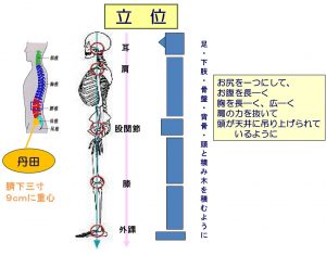 適切な立位は、耳・肩・股関節・膝・足首」が地面と垂直になっています。その際、二つのお尻を一つにするように引き締め、お腹を縦に長―く、胸を縦横に大きくして、肩の力を抜き、頭の天辺が天井から吊り上げられるような姿勢です。重心が丹田にあるように意識してください。結果として、この姿勢は疲れにくく、かつ美しい姿勢になり、歩行の基本姿勢となります。